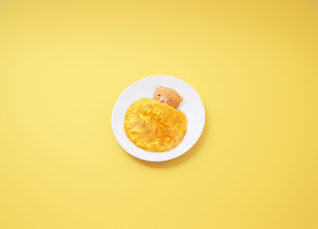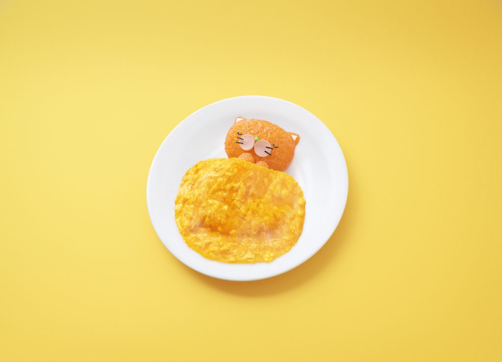 寝冷えネコ目、寝冷えネコ科のケチャップライスでできたネコ。「きよら グルメ仕立て」の卵で作ったお布団をかけてあげないと、寝冷えてしまう。愛称は、きよニャ。